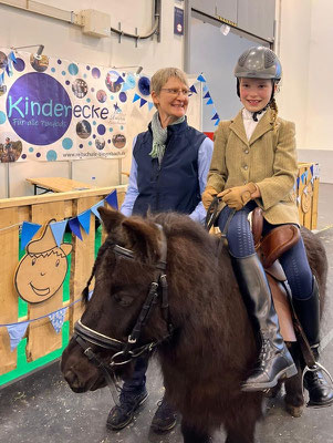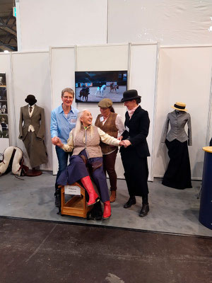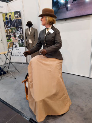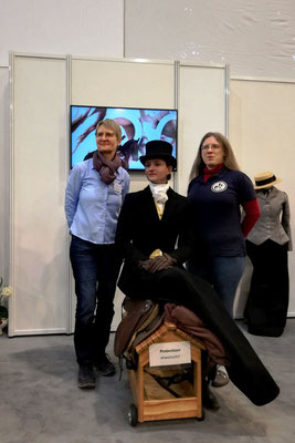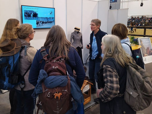 Und heraus kam ein bestens vorbereiteter, für Präsentationen gut geschnittener Messestand, günstig gelegen am Tribünenring in Halle 6. Mit einem Bildschirm, der auch Kurzvorträge zuließ, und vielen Fotos und Videos. Mit Puppen mit Habit und historischem Kostüm. Und natürlich mit einem Sattel zum Probesitzen.